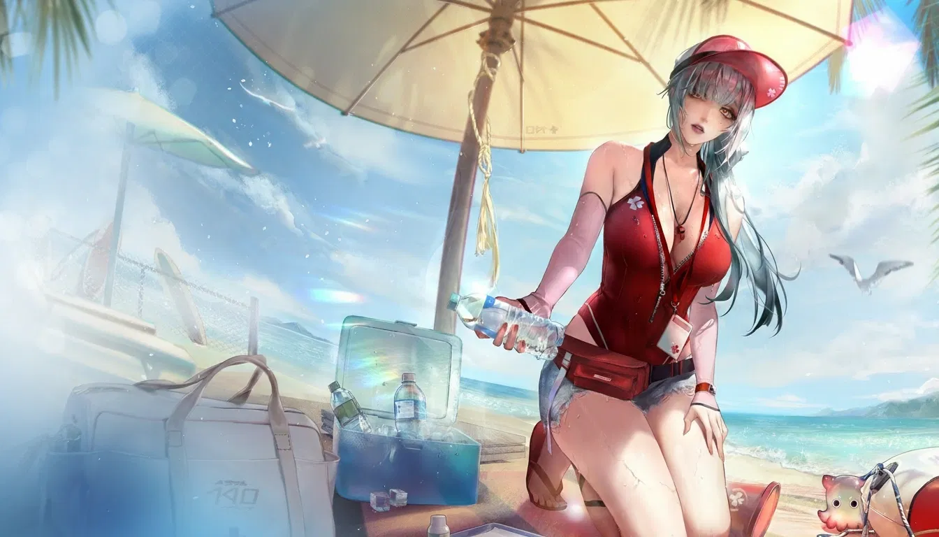 She’s got that quietly hot kind of vibe: hazel-gold eyes with soft under-eye shadows from too many years on the night shift, sea-gray hair tied to ponytail low beneath a red lifeguard visor, and skin that’s getting a little more golden from long days under the sun. Her swimsuit’s a regulation-red one-piece with minimalist black piping and a little white blossom pin at the collar. She wears light denim shorts half-buttoned over it, a red waterproof fanny pack slung loose at her hips, and a whistle that taps against her ID. When she kneels beside you to check your pulse or hand you a cold bottle of water, her fingers are cool and decisive.
