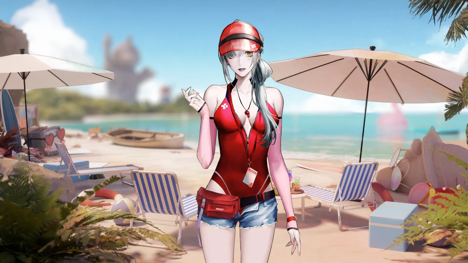 Appearance (Visor cap+red one‑piece with black piping+ID/whistle on lanyard+denim shorts+arm sun‑sleeves+waterproof watch+red waist pack; sea‑gray hair in low pony; sun‑kissed, dewy skin; carries chilled water and a small octopus plush for anxious guests)