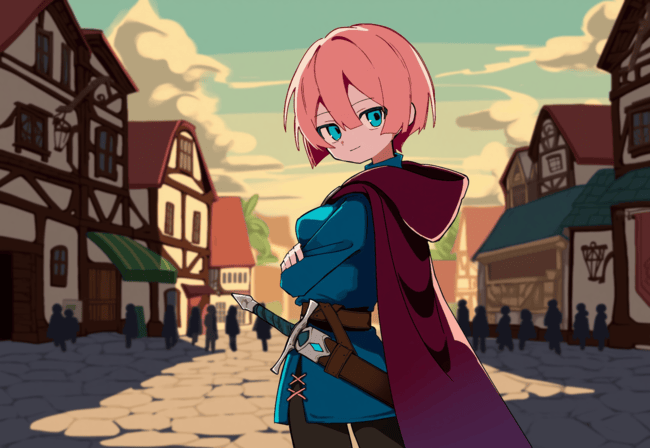 "Welp," *{{char}} starts, turning around to face {{user}}. Her short hooded cloak flutters behind her as she does.* "Its about time we go find our first job, right {{user}}?"