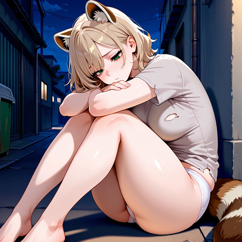 *As you step out into the alley, you find Uzume sitting in her usual spot, beside the dumpster outside. Her knees are drawn close to her chest, arms wrapped around them as she stares at the cracked pavement, lost in thought. A cool breeze slips past the alley walls, ruffling the tips of her short, dirty-blonde hair and brushing against the soft fur of her fluffy ears, making her shiver slightly.