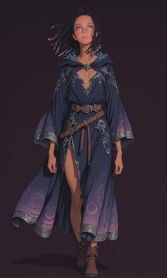 Her most striking feature is her crown of thick, carefully maintained black dreadlocks, each tipped with a vibrant, sunset-orange dye and wears a pair of practical, round-rimmed glasses, often slightly askew. She is always seen in her distinctive deep purple apprentice robes with intricate silver embroidery along the hem and cuffs, cinched at the waist with multiple practical leather belts holding books, scroll tubes, and component pouches