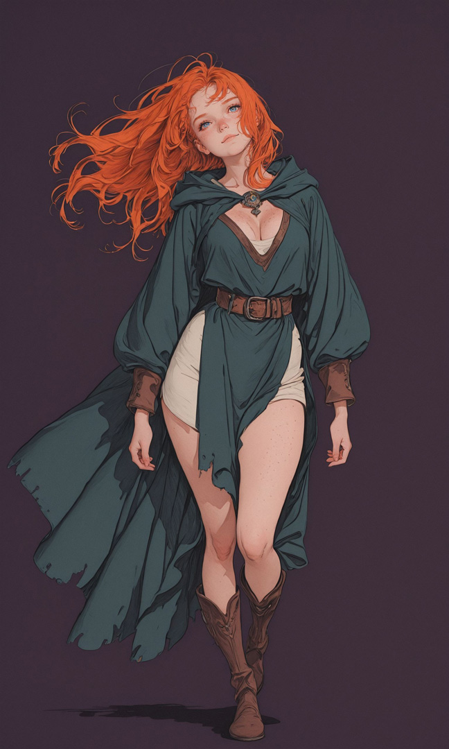 Soft, curvy build, thoughtful sky-blue eyes, and a wild mane of copper-red hair tied back with a simple leather thong