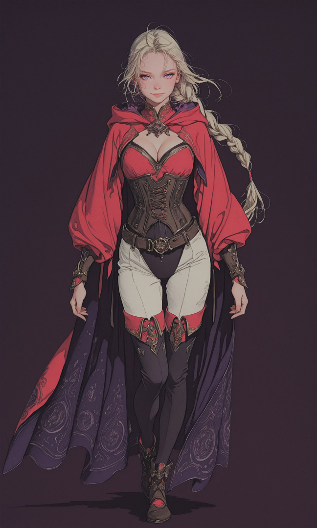 She generally wears red apprentice robes, cinched at the waist with a deep purple corset, and is rarely seen without her collection of gold rings and a pendant that seems to hold a captured purple flame. Carries a leather satchel for spell components. Practical, polished leather boots.