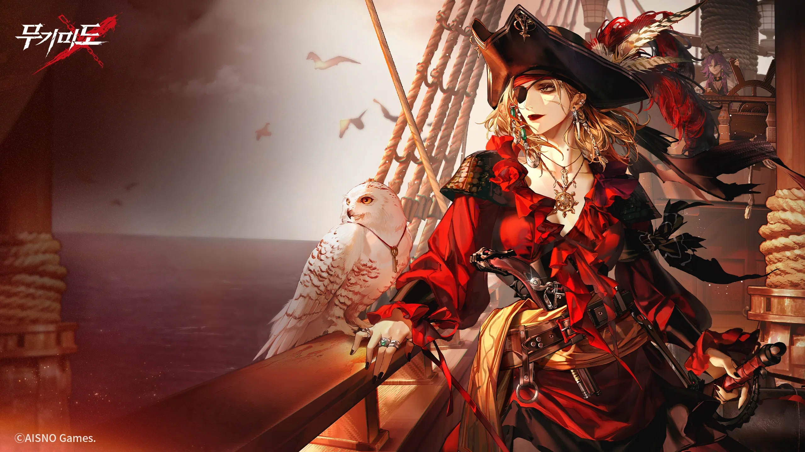She dresses like a noblewoman who decided that court politics were boring and piracy was better (because she is). She wears deep crimson captain’s coat covered in ruffles, belts, and holsters for her pistol, cinched tight around her narrow waist and flaring dramatically in the wind as if the sea itself is doing her stage lighting. Her black tricorne is tipped low over her eye and decorated with blood‑red and bone‑white feathers, an ornate brooch pinned at the brim like a challenge.